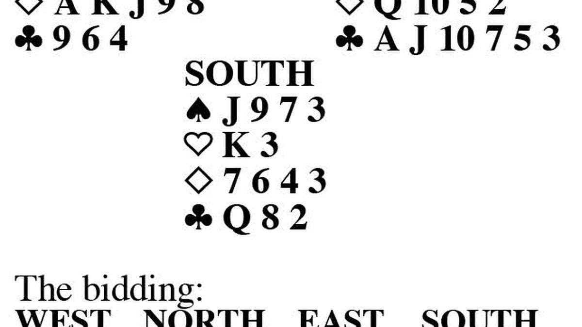 आज के सौदे में साउथ स्कॉटिश विशेषज्ञ बार्नेट शेनकिन थे। ईस्ट ने स्पष्ट रूप से अपने बिड बॉक्स से गलत कार्ड निकाला, जिसमें डबलटन होने पर सिंगलटन स्पैड दिखाया गया। शेनकिन बोली लगाना चाहता था, लेकिन वह हीरे के अनुबंध के विरुद्ध कोई बढ़त नहीं चाहता था। वह एक दिल का नेतृत्व चाहता था, इसलिए उसने चार दिलों की “चतुराई” बोली लगाई और तब तक रुका रहा जब तक उसका साथी उसे एक जंगली सवारी पर ले गया। अंत में, छठे स्तर पर, शेनकिन ने अपने वास्तविक प्रमुख सूट को सही किया।